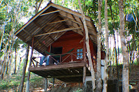 Nous nous adressons à la première réception que nous trouvons, celle du Longbeach Bungalow. La gérante nous propose deux styles de bungalows : soit directement sur la plage, soit un peu plus en retrait. Nous choisissons la deuxième offre, moins chère (seulement 4 euros/nuit le bungalow). En fait, il n’y a pas grande différence entre la première et la deuxième offre. Notre bungalow se situe à 10m de la plage avec une vue imprenable sur la mer (oula.. ça fait très réclame immobilière mon truc là !!!). Il est juste moins classe que ceux un peu plus bas, mais son confort nous convient très bien : petite terrasse avec hamac, chambre avec un lit double et moustiquaire et une petite salle de bain privative.