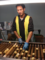 Mardi matin, je prends mon poste, devant une table (la main table : la table principale), des pommes de terres défilent (très vite) sur un tapis... le jeu consiste à attraper les moins belles...et les jeter sur un autre tapis pour les animaux. 10 heures, la pause, j'ai le mal de mer, à force de voir passer les patates et de ne pas regarder ailleurs mon cerveau commence à se sentir mal. Mon objectif : changer de poste...